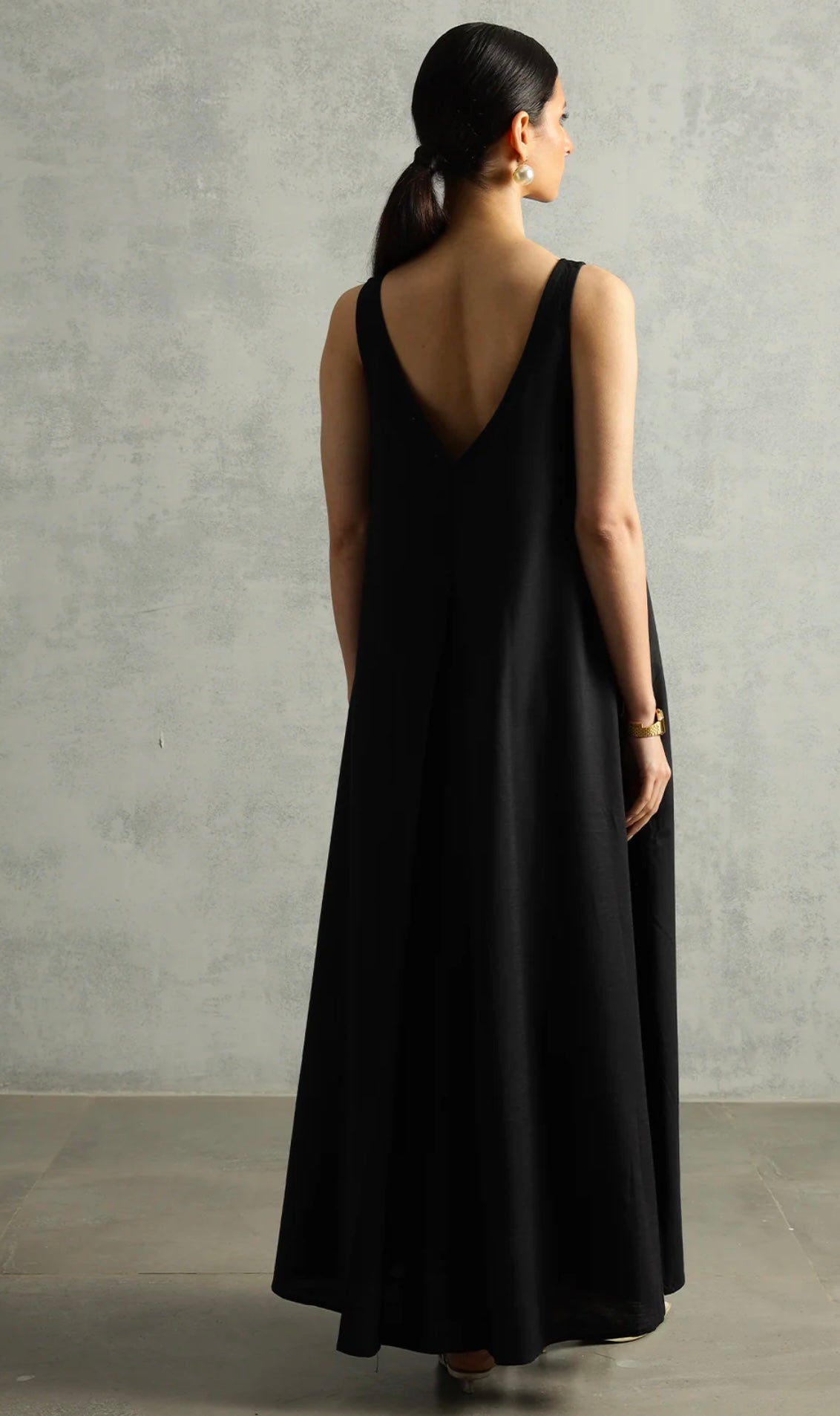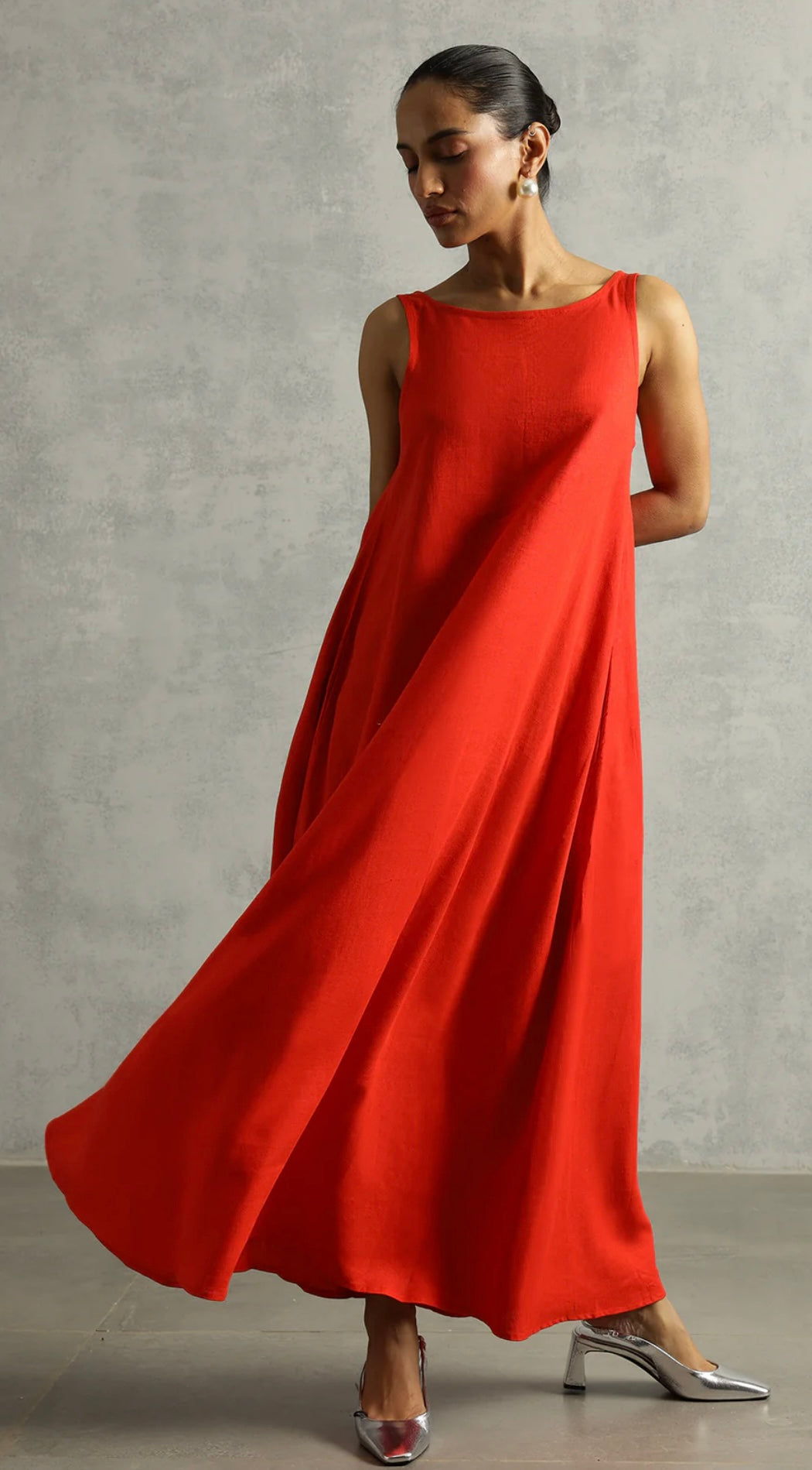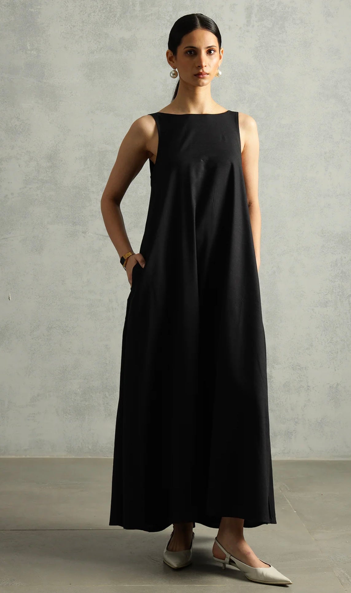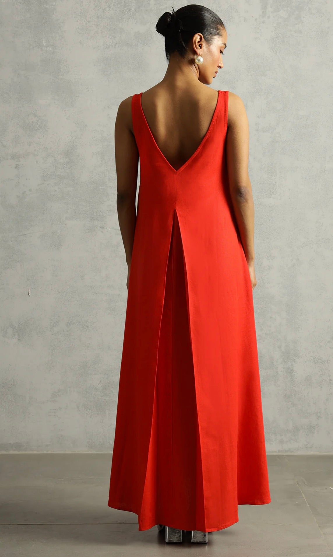 DRESS DESIGN: Sleeveless, ankle-length purple dress with pleated design on the upper part and a V-shaped neckline