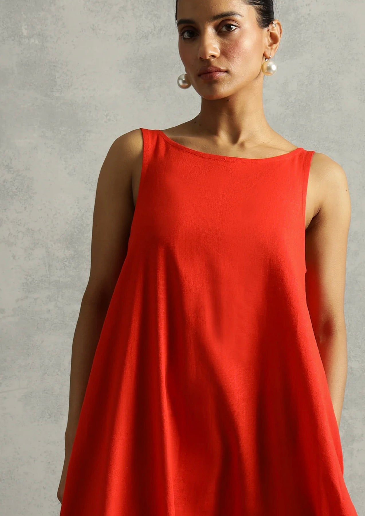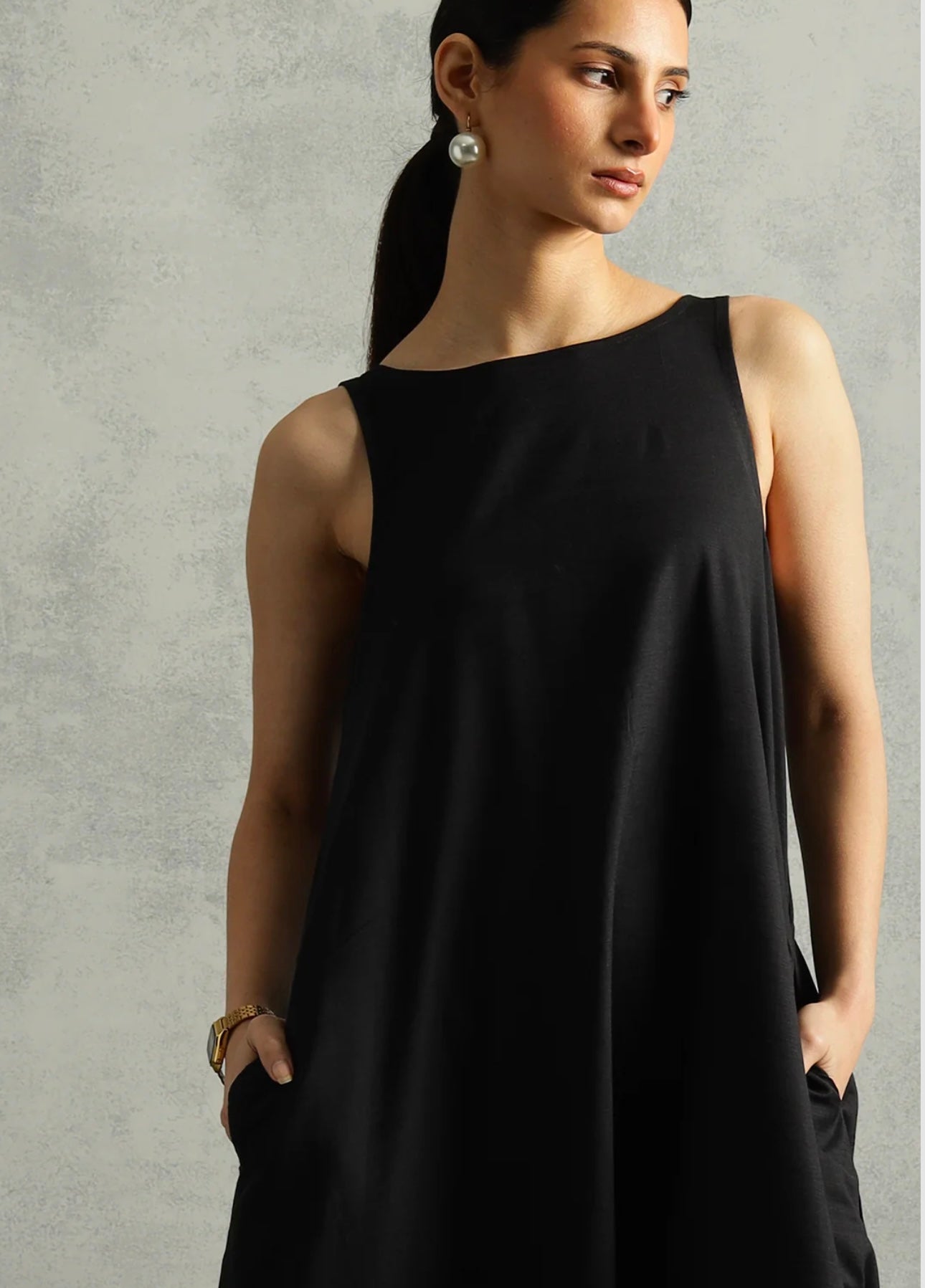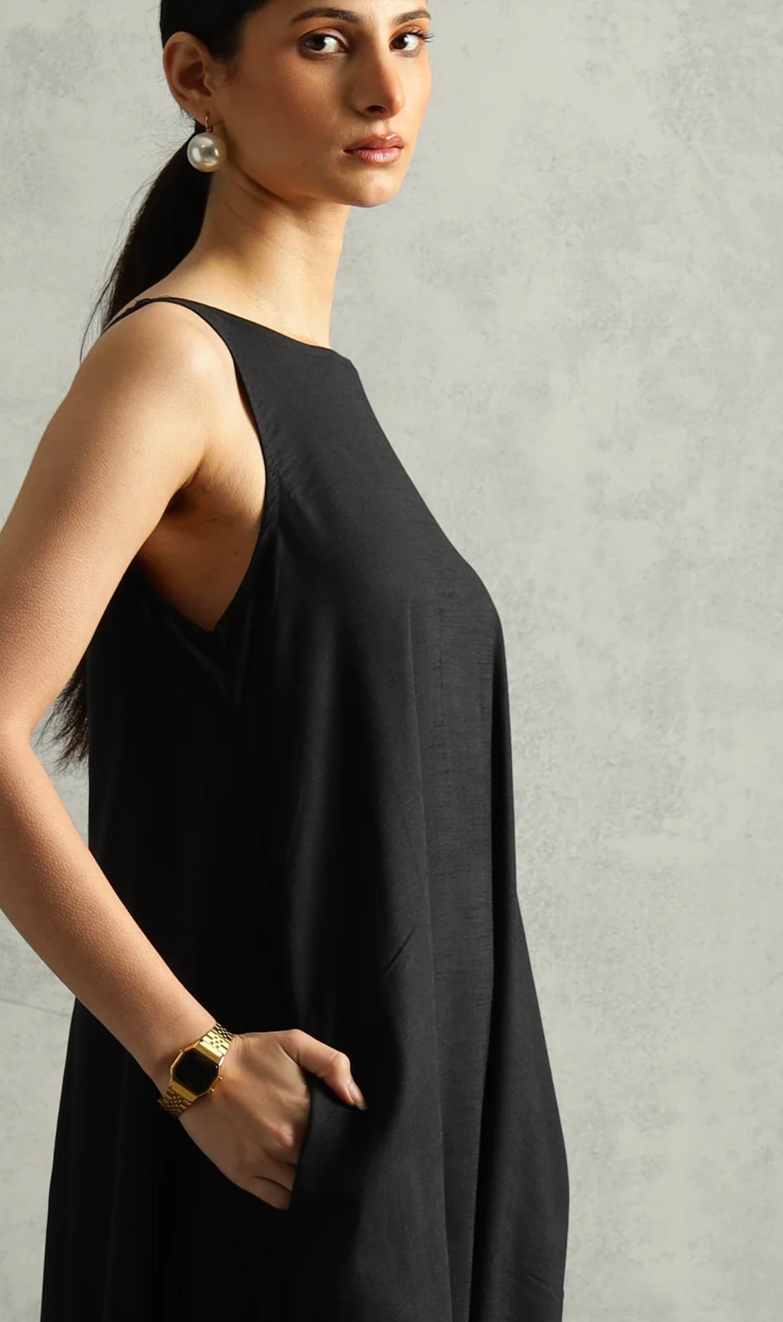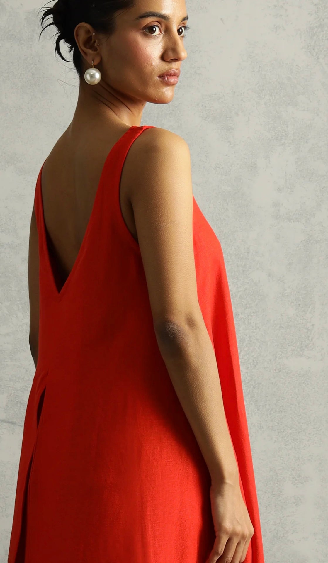DRESS DESIGN: Sleeveless, ankle-length purple dress with pleated design on the upper part and a V-shaped neckline