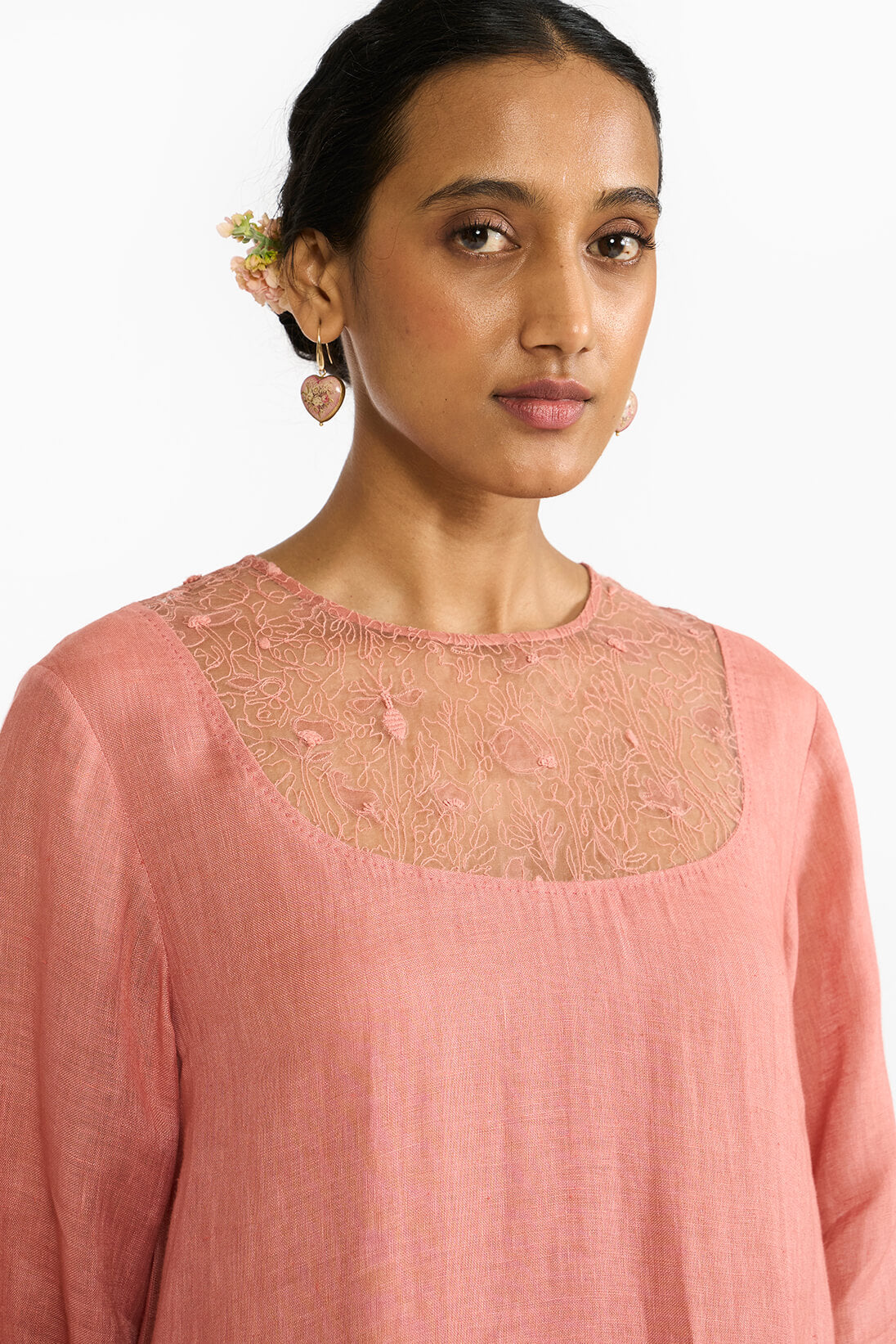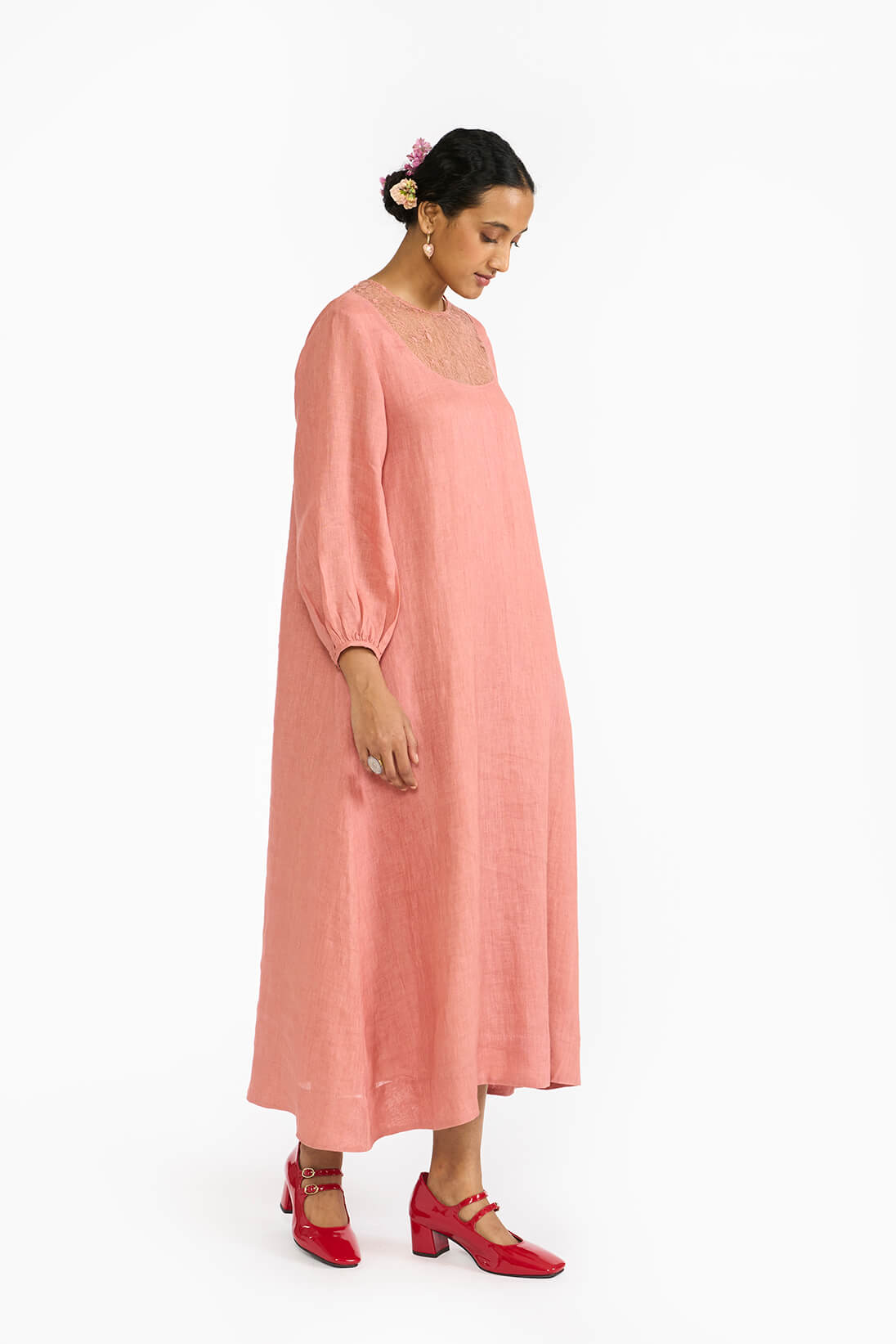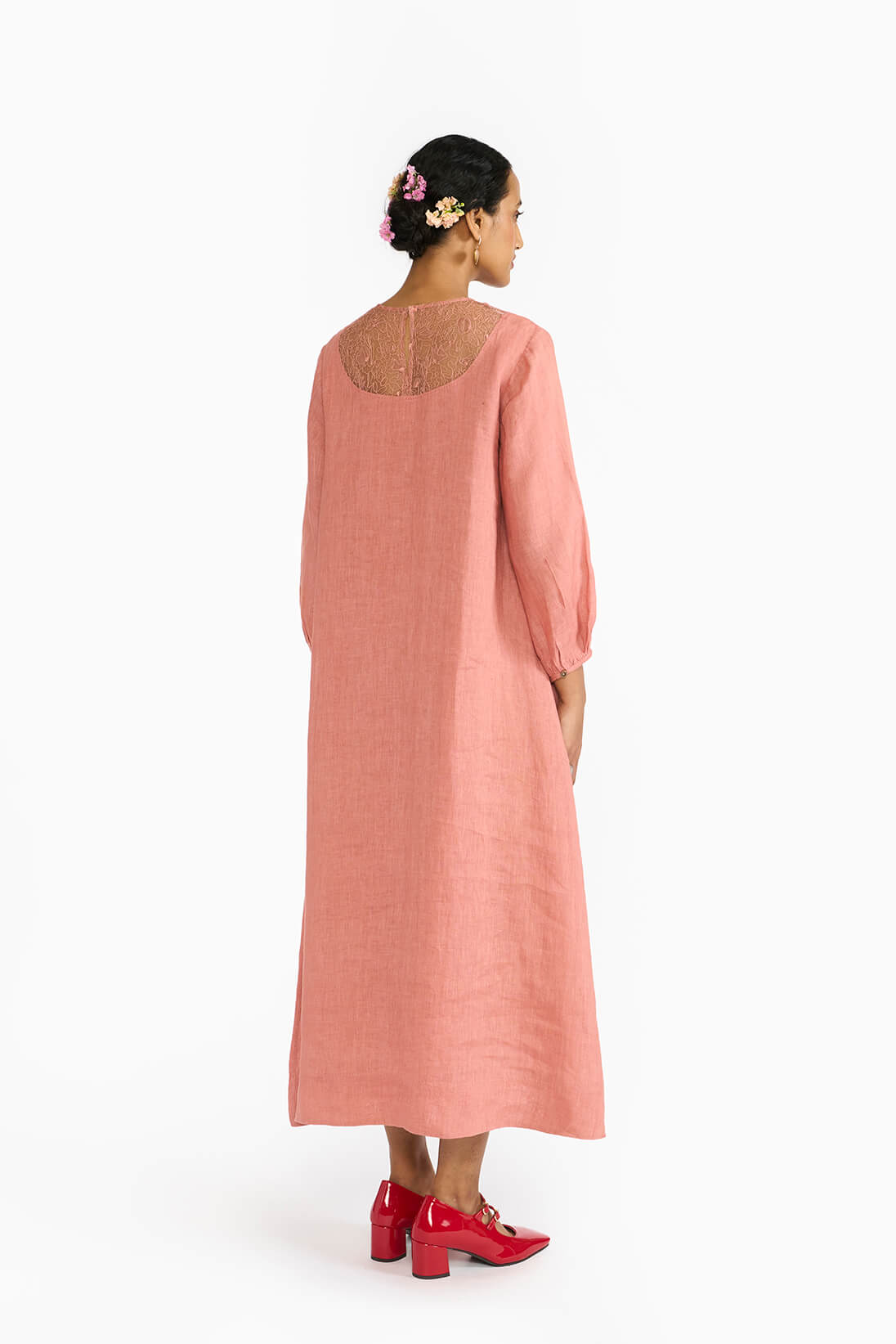The Rohini Dress is a romantic ode to handcrafted elegance. It features: